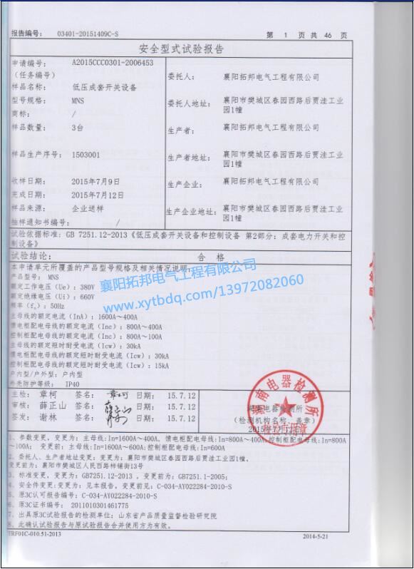 低壓成套開關設備MNS 強制性產品 試驗報告