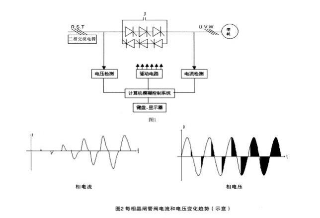 當起動完成后, 三相旁路接觸器 J 自動吸合, 電動機投入電網運行(見 圖 1)。輸入/輸出電壓波形和電流變化的波形